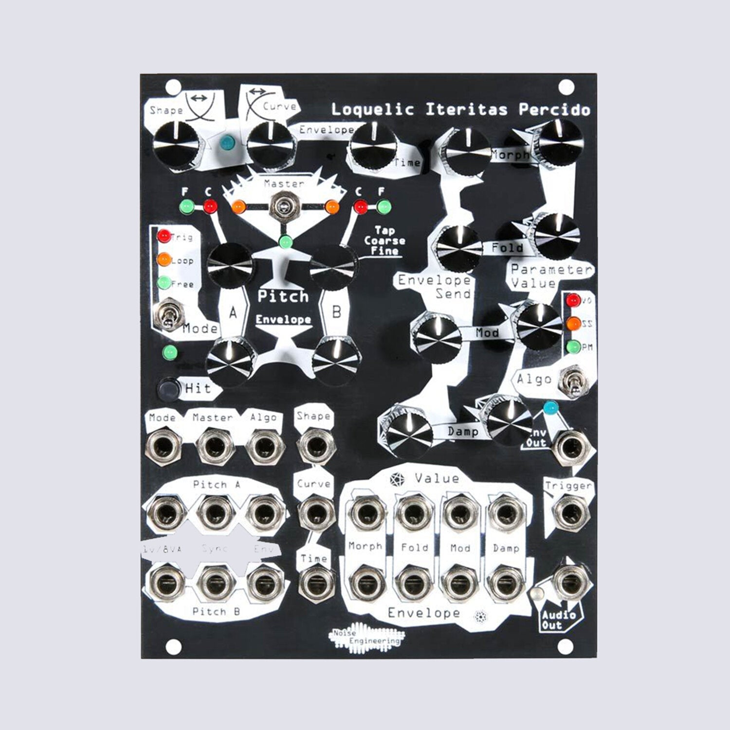 Loquelic Iteritas Percido is an extension of the original Loquelic Iteritas. Like its baby sibling, Loquelic Iteritas Percido is a digital VCO with interpretations of three classic synthesis algorithms involving dual pitch control parameterized by four tone controls. Loquelic Iteritas Percido adds an envelope that can be shaped and routed to pitches and tone controls, making it into a free-standing voice. With the flip of a switch, disable the envelope for use as a free-running oscillator, loop it, or set it to triggered mode. All parameters are CV-able: LIP eats modulation for breakfast, lunch, and dinner.